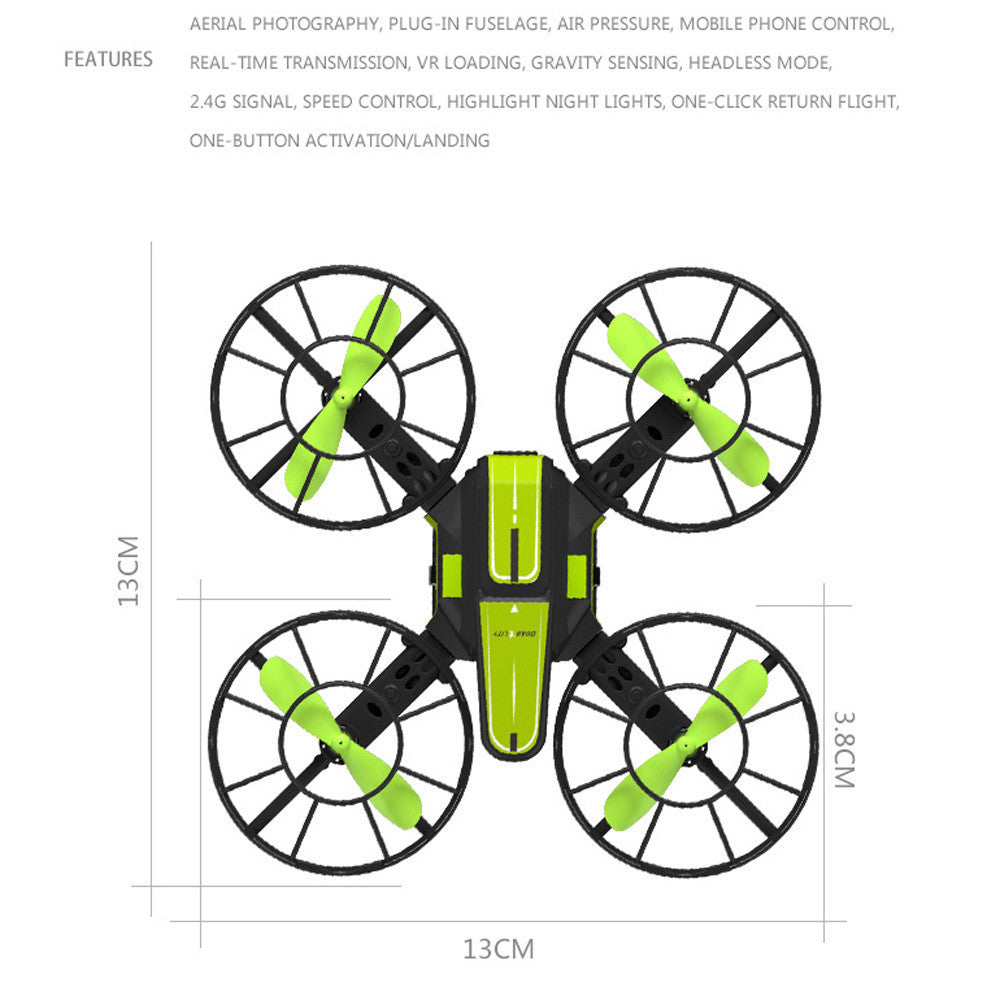 - Function:Up / Down, Left / Right Sideway Fly, Forward / Backward, , Turn Left / Right,aerial photography,plug-in fuselage,air proeeure,mobile phone control,real-time transmission,vr-loading,gravity sensing,Headless Mode, 2.4g signal,speed control,highlight night lights,one-click return flight,one-button activation/landing,360 Degree Rollover